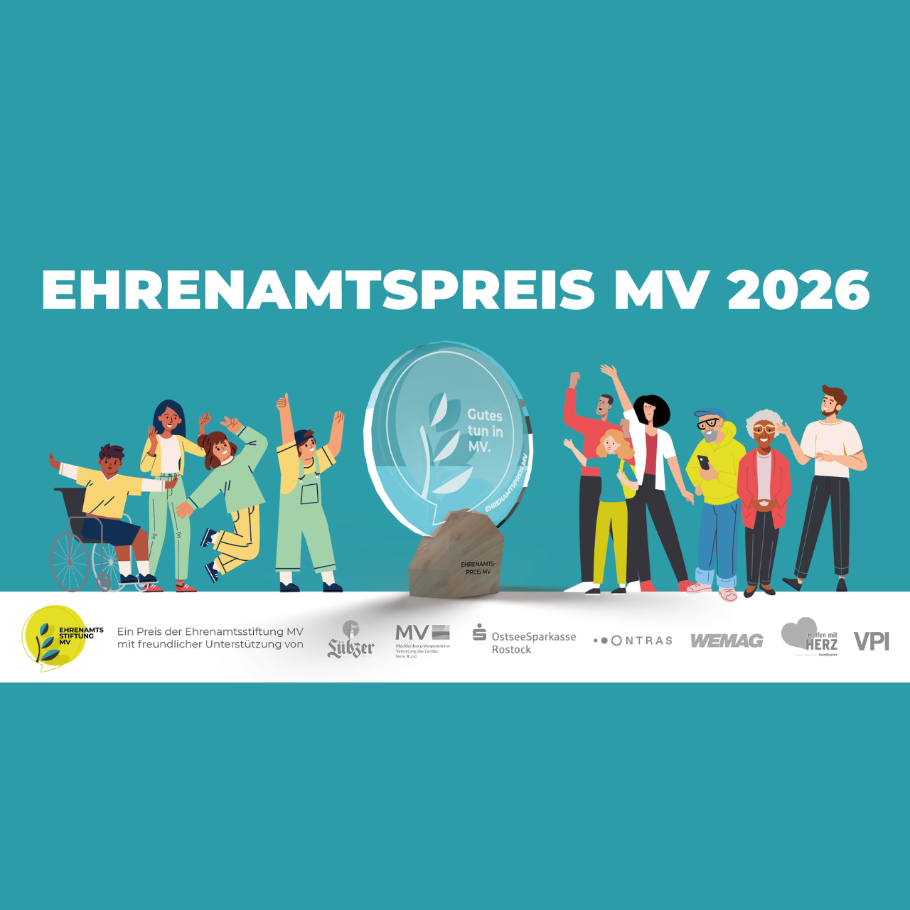 3.000€ Preisgeld, einen tollen Pokal und die Nominierung eures Projekts für den Deutschen Engagementpreis. Außerdem erhält ein Gewinnerprojekt den Sonderpreis der Landesvertretung MV.
